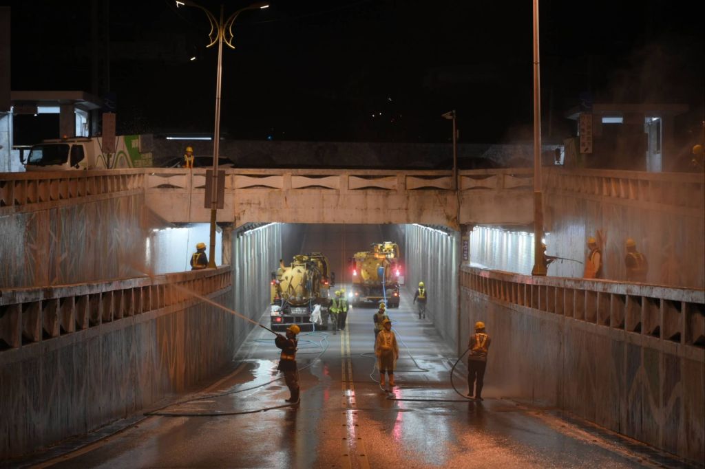 為帶給市民以及觀光客更優質的環境,花蓮市清潔隊自去(113)年12月起,即針對市區公共設施展開清洗作業,繼日前完成北濱外環道清洗作業,3日晚間則在中山地下道執行養護工程。清潔隊動員31名人力、7輛重型車輛,隊長吳慶展全程在場督導作業進行,隊員抓緊時間陸續完成牆面清洗、兩側邊溝疏濬以及地面清洗作業,在4日清晨提前恢復通行。
