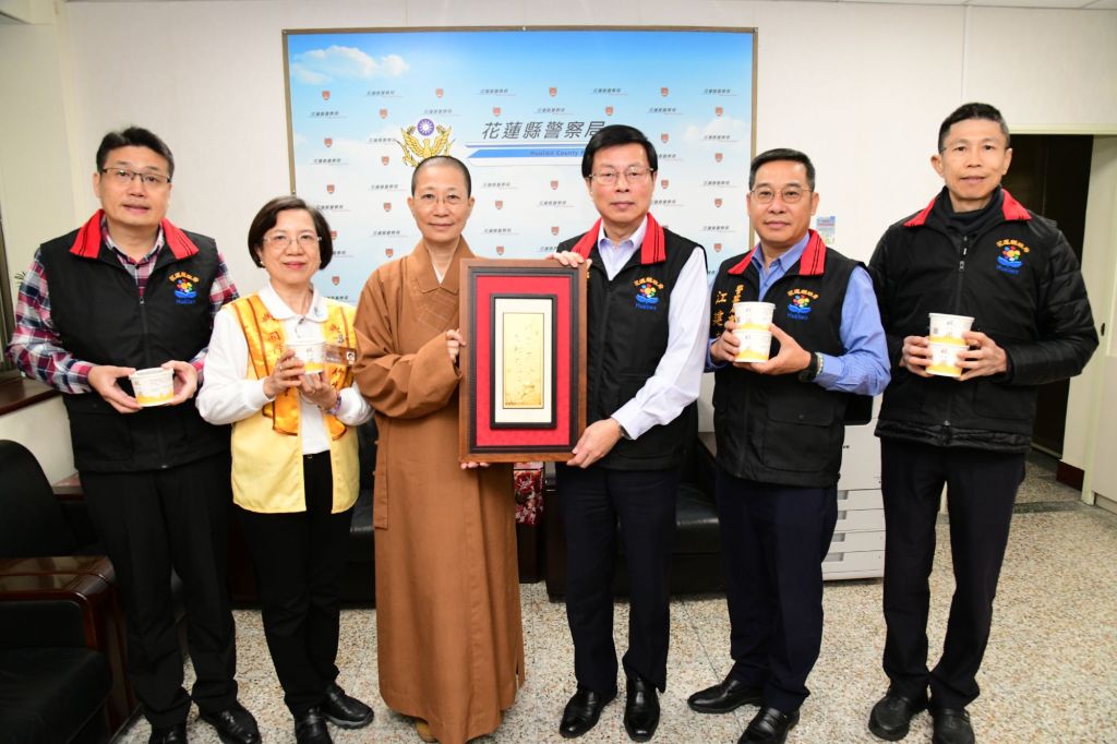 臘八節到來,佛光山佛光會月光寺第二分會公關組督導張淑禎(花蓮縣警察之友會榮譽理事長李武寬夫人)及佛光山月光寺監寺妙勳法師2位貴賓,特地於1月7日送來312份熱騰騰臘八粥至縣警局供警察同仁享用,除感謝警察去年從0403到0423地震後協助救災及維持震後治安平穩外,也感謝颱風凱米、山陀兒及康芮接連侵襲花蓮時,警察對治安、交通的貢獻與付出,也祝福每一位同仁在家庭及工作崗位上都能順心如意,圓圓滿滿。