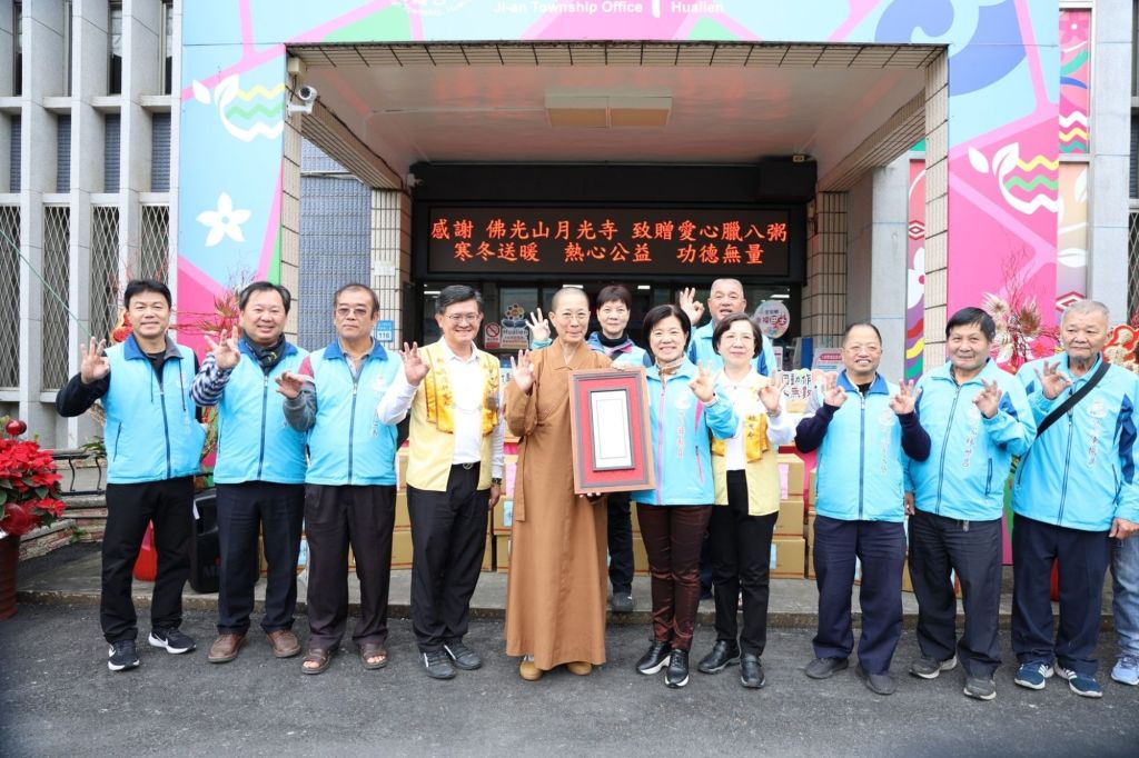 游淑貞鄉長則對妙勳法師與月光寺師兄、師姐、志工們表達無限的感謝,提到在去年震災後,月光寺開放受災戶安置,鄉親落淚感謝的場景迄今仍縈繞腦海。而經過這幾年臘八粥分享活動,讓臘八節在吉安,除了有「佛成道日」的紀念,更多了分享溫暖、祈求吉祥的意義。而月光寺把佛光山的精神帶到花蓮,也讓更多誠心禮佛的鄉親,在吉安就能感受到大雄寶殿的莊嚴,也令人感受的佛在人間的慈悲。