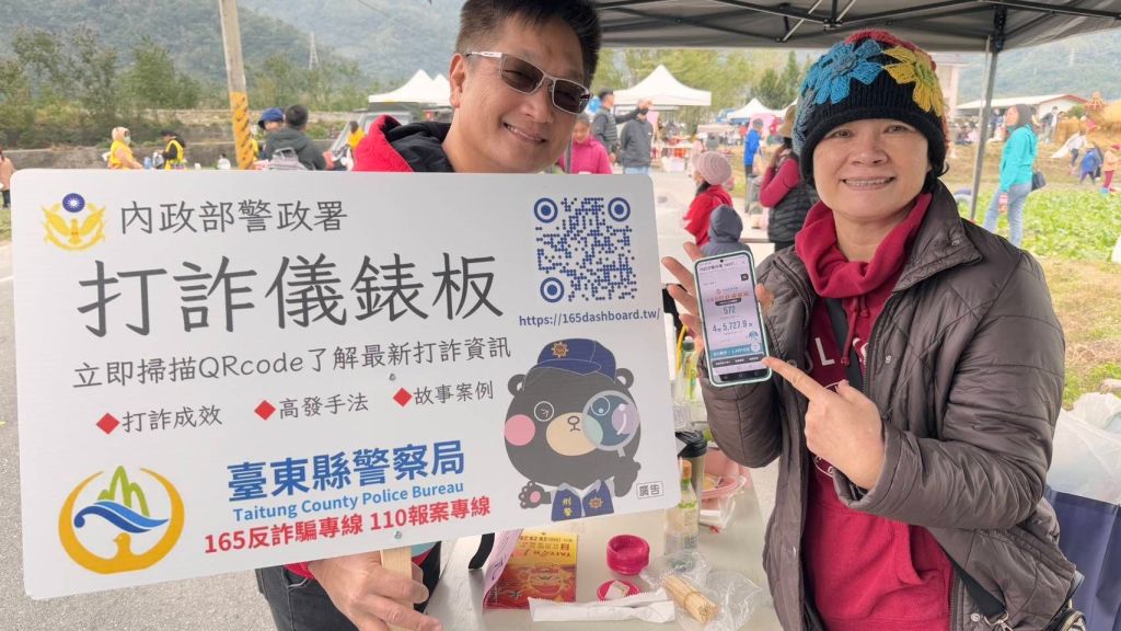 「開拔」!臺東縣關山鎮公所於昨(18)日上午9時,在豐泉里臺9線315.5處(佛緣禪寺指標處進入)路旁,舉辦「2025關山千人蘿蔔季」活動,吸引了數百位大小朋友體驗田野拔蘿蔔的樂趣。臺東縣警察局關山分局除於現場執行交通管制及防竊等勤務外,亦有偵查隊及交通組設攤實施防詐及交安等宣講,鎮長彭成豐更以「大聲公」給力宣講防詐,提醒民眾一定要小心防詐!另請民眾以手機掃「打詐儀錶板」大型手舉牌上的QR-Code,即可進入到「打詐儀錶板」專網,並可獲得「反光拍拍圈」,讓大家識詐防詐又能行得安全,讓大家「拔得歡喜、拿得開心」,宣講效果滿點啦!