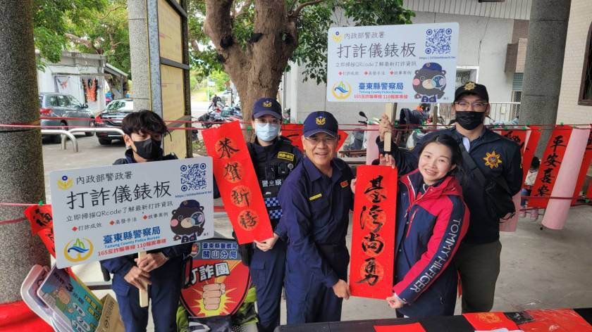 鹿野分駐所所長陳泰山自幼就對「書法」非常有興趣,每逢年節,就成為鄰里友人爭相邀請揮毫寫春聯的第一選擇。於前(18)日就受鹿野鄉崑慈堂的邀請,透過揮毫寫春聯免費贈民,拉近警民關係,整場活動和樂融融、年味十足。另臺東縣議會議長吳秀華、議員陳宏宗、潘貴蘭、鄉長李維順、代表會主席陳韋吉、代表鄧清欉、郭清塗、農會總幹事陳正笙及村長蔡登源等人,於會場與民同樂。陳所長隨後上臺向數百名鄉親宣講「114年加強重要節日安全維護工作」,此專案工作自1月20日22時起至2月3日止,為期15日,期間以「治安平穩、交通順暢、民眾安心」為工作主軸,並有提供大額存(提)款護鈔及舉家外出住居安全維護等服務,有需要的民眾得逕向轄內分駐(派出)所提出申請。也呼籲民眾,返鄉圓圓餐敘,切勿酒後駕車,以免樂極生悲。最重要的還是要小心防詐,內政部警政署為讓民眾迅速取得防詐識詐資訊,特設置「打詐儀錶板」(https://165dashboard.tw/),該專網內除有民眾被騙案例、警察機關打詐成果及識詐宣導等功能外,更建構資料庫功能,方便民眾查詢、瀏覽,使民眾深刻感受自身週遭發生詐騙案件之嚴重性,進而強化防範意識,預防被害。