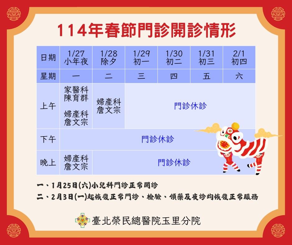 最後,為因應春節假期,北榮玉里分院114年春節門診開診情形如下,民眾來院前可至醫院官網、臉書確認門診時間,或撥打電話(03)888-2267詢問。
