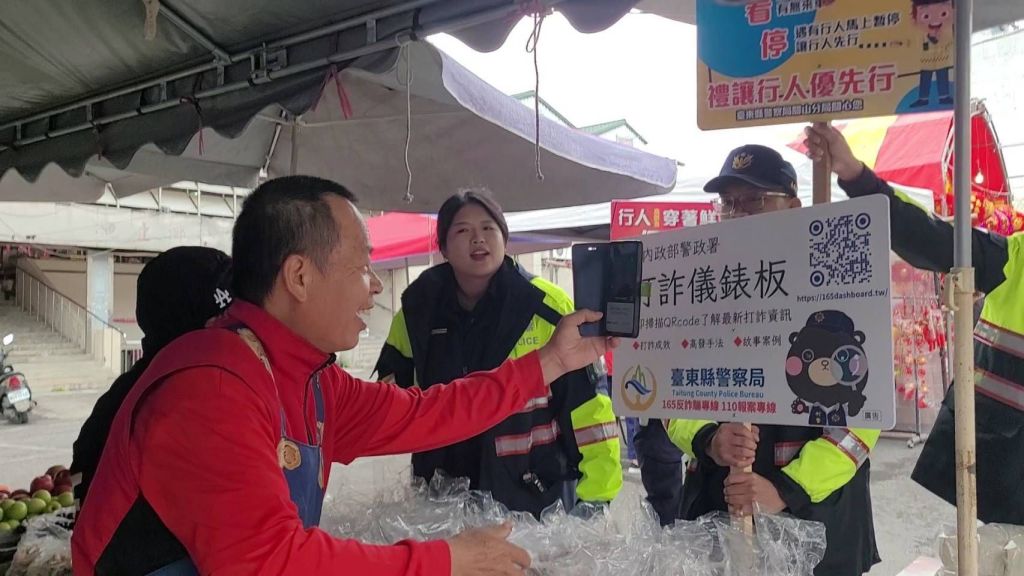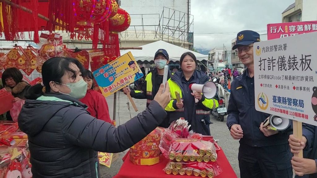 今(27)日為小年夜,隨著農曆春節即將到來,各鄉(鎮)傳統市場擠滿採購年貨的人潮,臺東縣警察局關山分局交通組長陸金銘特運用此一時機,率池上分駐所所長蔡欣妤、巡佐林張仲康、警員林威豪、劉博文、警察志工邱烈貞及徐郁琼等人,前往池上年貨大街掃街,宣講「114年加強重要節日安全維護工作」重點項目、酒駕零容忍及打詐儀錶板等。沿途以大聲公播放「掃碼打詐儀錶板QR-CODE送禮品,關山分局關心您」!蔡所長也欣慰民眾說明內政部警政署設置「打詐儀錶板」專網的用途,請民眾多加瀏覽分享,讓周遭親朋好友都成為「詐騙絕緣體」!