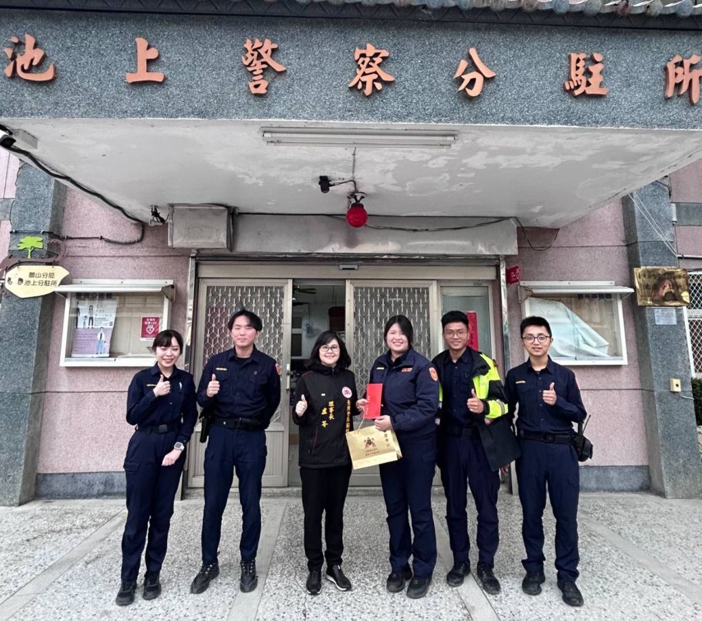 農曆春節即將到來之時,「臺灣警雁關懷協會」理事長盧苓因體念臺東縣警察局關山分局全體同仁整年度工作之辛勞,特於今(28)日除夕10時許,在助理的陪同下前往池上分駐所及分局本部,致贈慰問金及有機茶,表達慰勉之意!盧理事長一行人受到副分局長温綮騫、組長蔡蘭貴、陸金銘、所長蔡欣妤及所內同仁的熱情歡迎,並感謝盧理事長的用心,讓警察同仁備感窩心。