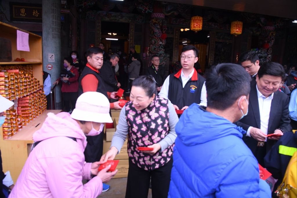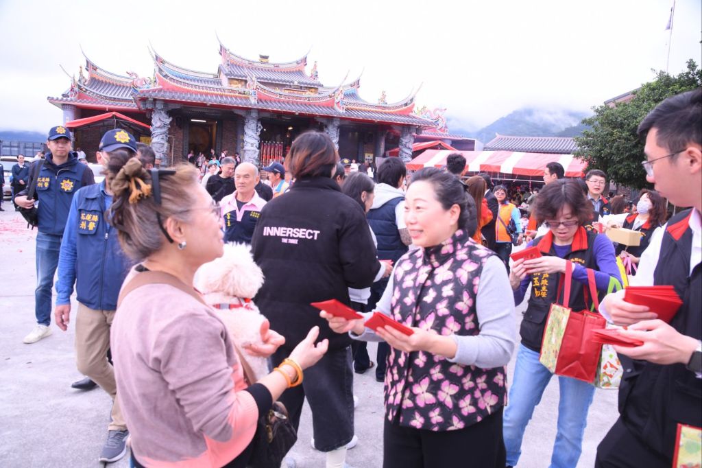 大年初四天公作美,徐縣長及傅立委一抵達即展現親民就親和力,與現場鄉親握手問好,並向眾神菩薩敬拜祝禱,許多鄉親攜家帶眷依序領取縣長親手發送的新春福袋,並紛紛要求與縣長合影留念,現場氣氛歡欣熱絡。縣長徐榛蔚表示,很開心看到鄉親們返鄉過節,趁著今日好天氣,也歡迎大家多多出門走春,到廟裡參拜,祈求來年的好運。