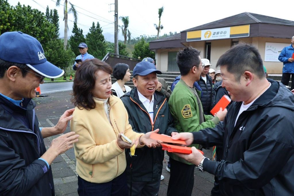 花蓮縣議會於2/3日上午舉辦開工活動,議長張峻偕同全體議員、員工、議員服務處主任、助理,一同前往鯉魚潭環潭步道,以健行的方式迎接新一年的挑戰。活動從鯉魚潭環潭步道北側集合出發,暖身操後進行團拜,大家互道恭喜,互祝新春快樂,隨即張峻議長開始發放開工紅包,健走路線沿途鳥語花香,空氣清新,讓參與者們在舒緩的步調中,洗滌身心,感受自然生態的療癒魅力。