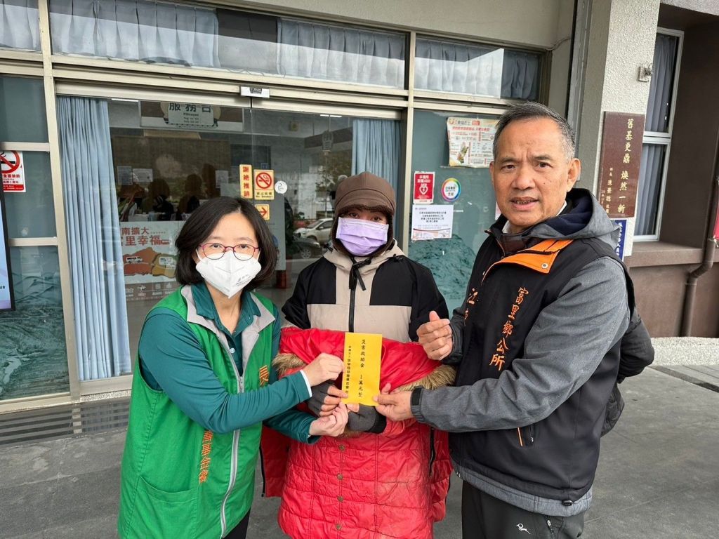 富里鄉公所在災後積極評估受災情況,並向張榮發基金會轉介多戶弱勢低收家庭的災害救助案件,期盼能為鄉親爭取必要的協助。適逢農曆春節前夕,鄉長江東成與張榮發基金會專員江小姐親自發放災害救助金,為受災戶帶來溫暖與支持,讓他們能夠安心迎接新的一年。受贈鄉親對於這筆即時的救助金深表感激,紛紛表示這不僅是物質上的幫助,更是一份心靈上的慰藉,讓這個寒冬增添溫暖。