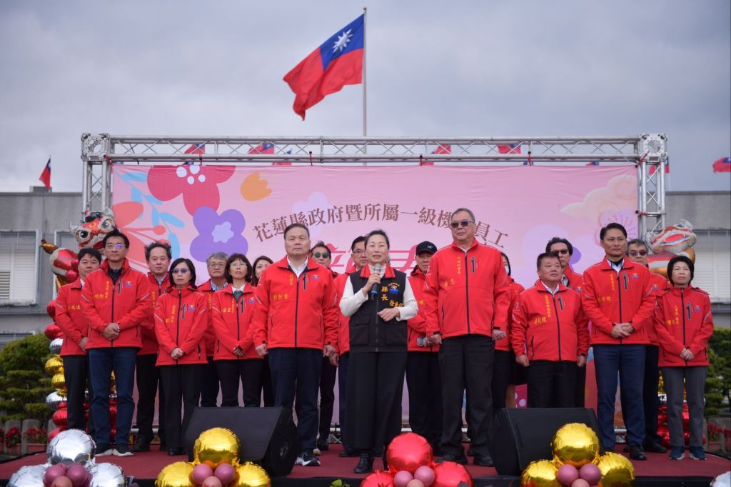 花蓮縣政府今(4)日舉辦春節團拜活動「花蓮縣政府暨所屬一級機關114年春節員工團拜」,活動由全體同仁高唱國歌揭開序幕,北玄宮醒獅團接續帶來精彩演出,增添喜氣,縣長徐榛蔚、副縣長顏新章手持蘿蔔與鳳梨,寓意「好彩頭、旺旺來」,祈願花蓮百業興隆、風調雨順。