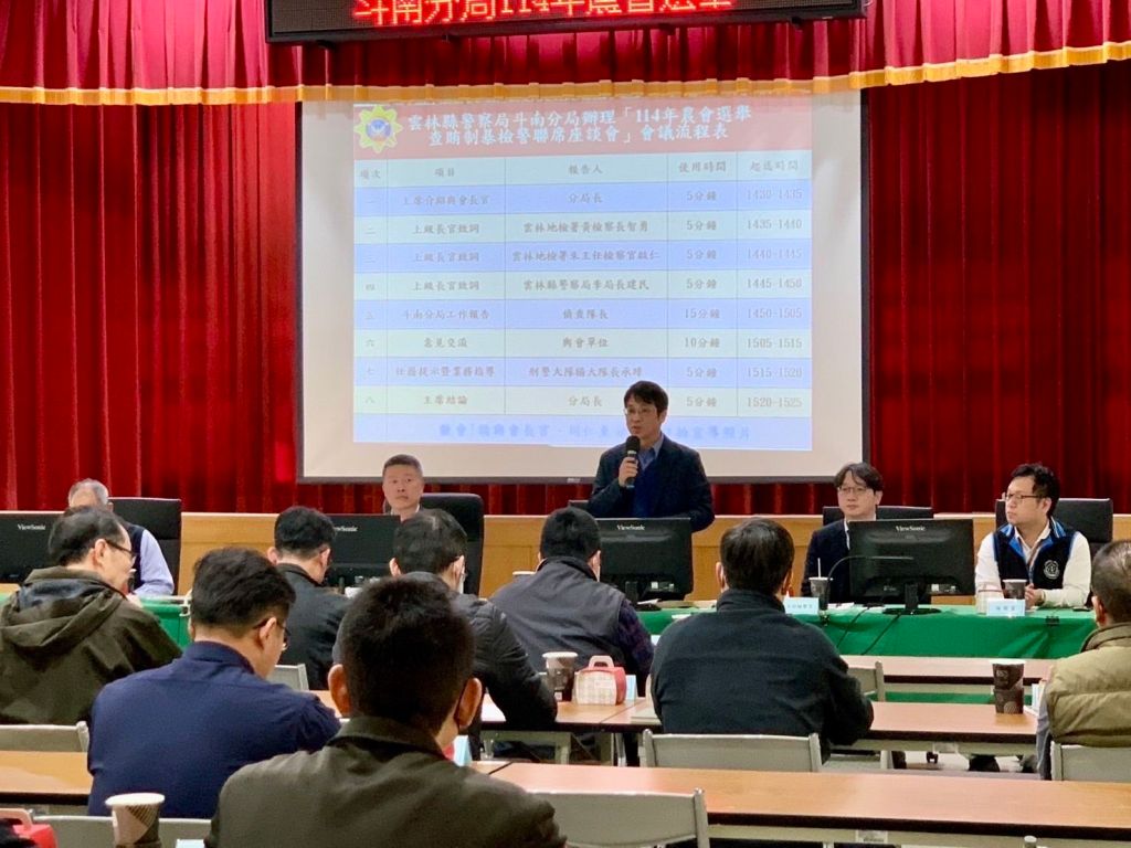 114年度農會改選將於2月15日投票,雲林地區部分農會出現競爭激烈情形,臺灣雲林地方法院檢察署檢察長黃智勇、主任檢察官朱啟仁、檢察官彭彥儒會同雲林縣警局局長李建民、副局長陳瑞金、刑警大隊長楊承璋、保防科長蘇文俊、保安科長李建興、斗南警分局長張明忠、各派出(分駐)所所長及偵查隊隊長等人,就即將舉行之農會選舉舉行查賄制暴座談會,對於轄區選情分析,及查察賄選、暴力防制各項工作進行研討精進凝聚共識,全力防堵並打擊賄選、暴力等不法手段介入選舉。