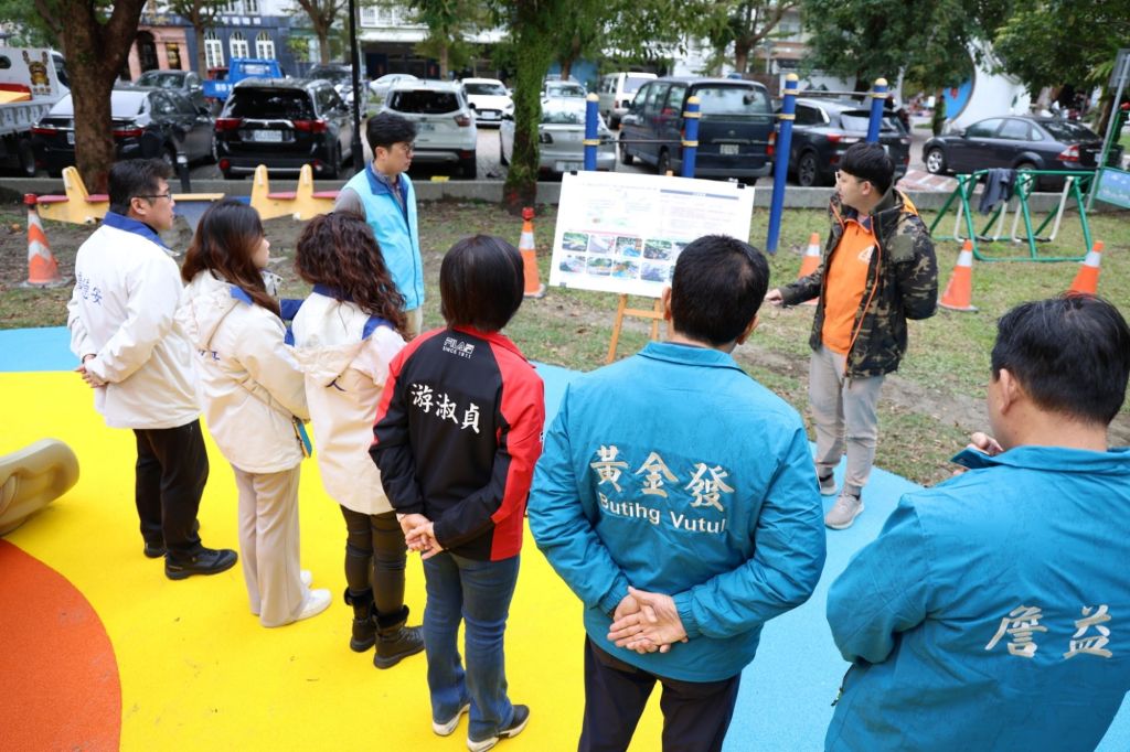吉安鄉公所為增加更多安全合宜的親子戶外活動空間,積極推動提升兒童遊戲場的安全與完善,鄉長游淑貞近日率鄉公所建設課長吳印浴,協同鄉民代表、村長到「榮安公園」兒童遊戲場設施改善工程施作現場進行會勘,關心工程進度並討論工程及相關細節,以確保工程品質與未來使用安全無虞。