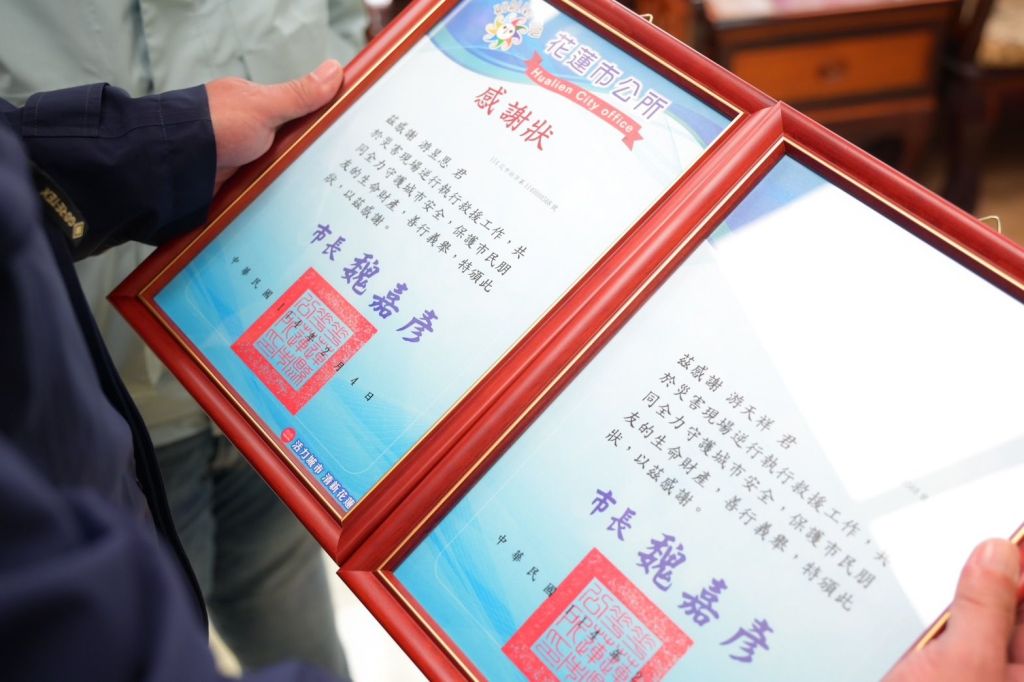 魏市長表示,游天祥和游昱恩的見義勇為是社會的表率,能夠在面對危險時,發揮機智與勇氣,不僅為社區帶來了平安,也才沒有進一步造成巨大損失,花蓮市公所得知消息後,也希望大力表揚這對父子,同時讓更多市民一同為他們感到驕傲。