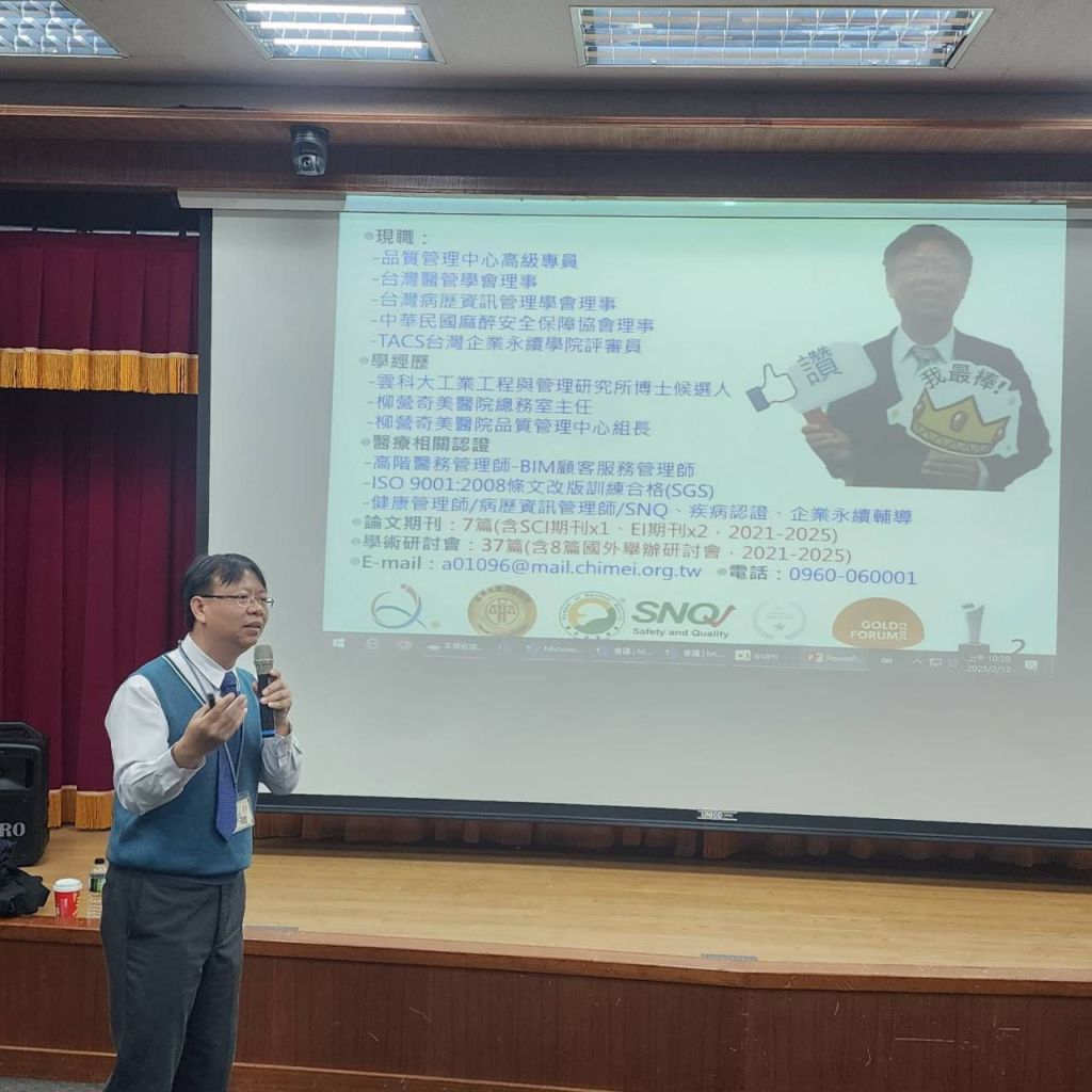 此外,為符合國內外醫療品質認證標準,張基生專員特別解析醫院評鑑基準、學(協)會認證及相關法規,強調跨部門協作在品質管理中的關鍵作用,讓醫院不僅強化專業形象,更能提升競爭力,為病人提供更高水準的照護。
