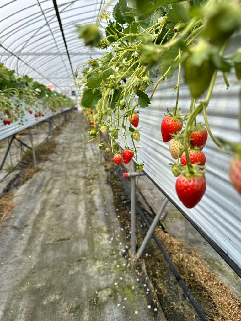「草莓屋天空農場」以 高架栽培技術 為特色,讓草莓在架高的種植環境中生長,不僅能避免病蟲害,提高產量與品質,也能讓農民減少彎腰作業的負擔。此外,這座農場還導入 智慧監控系統,透過 AI 來調控溫度、濕度與養分,確保草莓在最適合的環境中生長。
