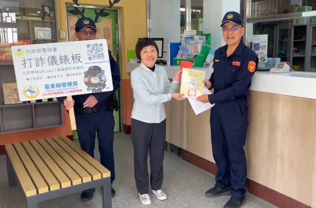 為強化民眾防詐意識,臺東縣警察局關山分局長鍾國楨於今(18)日9時30分許,率同偵查隊隊長鄭志舷及關山聯合所同仁,前往關山郵局、關山農會,另由鹿野分駐所長陳泰山至鹿野郵局,因上述金融機構於去(113)年11月至12月間,協助通報攔阻假投資2件、假交友2件、假借郵件招領及假親友詐財等6件詐騙案,共攔阻計約新臺幣300萬元。為感謝職員之協助,親頒「攔阻詐騙感謝狀」及禮券,表揚成功攔阻詐騙案件之貢獻,並宣講「打詐儀錶板」專網,呼籲全民共同打擊詐騙犯罪。