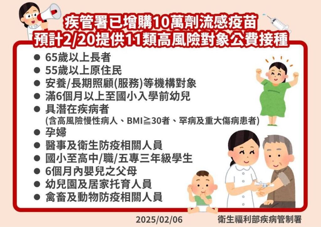 考量農曆春節後民眾接種流感疫苗踴躍,且時值流感疫情高峰期,因應民眾需求,為提升高風險族群接種率,減少重症與死亡,衛生福利部疾病管制署增購10萬劑公費流感疫苗,臺東縣衛生局獲配910劑流感疫苗,將儘速分送到16鄉鎮市衛生所,此次公費流感疫苗將自2月20日開打,提供11類公費對象接種,提醒民眾前往衛生所前,先致電詢問接種資訊及備妥相關證明文件,以免白跑一趟。