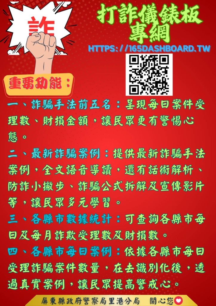 里港警分局長温基興呼籲聽眾朋友,詐騙集團會利用虛擬貨幣這種複雜和不易被人了解的市場進行欺詐,被害人通常在初期會收到小額的回報,進而增加投資,最終被大量吸金而無法追回損失,不要因為一時的貪念而讓自己掉入詐騙集團的陷阱。此外,要特別向聽眾介紹「打詐儀錶板」,大家可以在瀏覽器的地址欄中直接輸入「https://165dashboard.tw」,即可迅速進入「打詐儀錶板」網站,也可以在 Google、Yahoo 或其他搜尋引擎中直接搜尋「打詐儀錶板」,搜尋結果將顯示此網站的連結,點擊後即可順利進入,或是透過掃描QR Code的方式,快速連結到「打詐儀錶板」網站。「打詐儀錶板」每天會更新受理案件、財損金額,尤其網站內的「各縣市每日案例」更可以提供民眾熟悉詐騙手法,避免受騙上當,它不僅是一個數據平台,更是防詐意識的重要推動者,透過這個平台,希望大家能夠掌握詐騙手法的最新變化,學會有效保護自己的財產,避免損失。