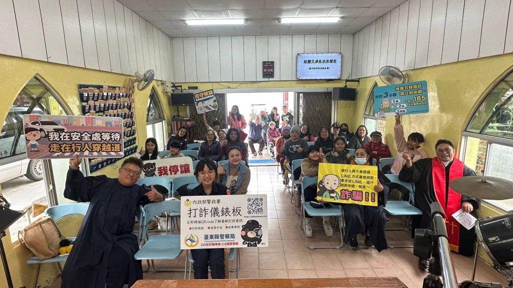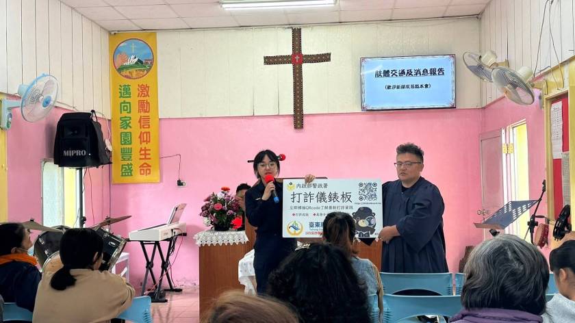 臺東縣警察局關山分局海端聯合所為強化偏鄉居民安全意識,於昨(23)日10時許,由警員許舜雯及陳信帆主動出擊,趁週日民眾前往錦屏教會聚會時機,以「行動警政」模式深入社區,透過生動宣講與互動問答,將交通安全觀念與最新反詐騙技巧帶入教會,現場逾50位居民熱情參與,直呼:「警察來教會上課真貼心!」