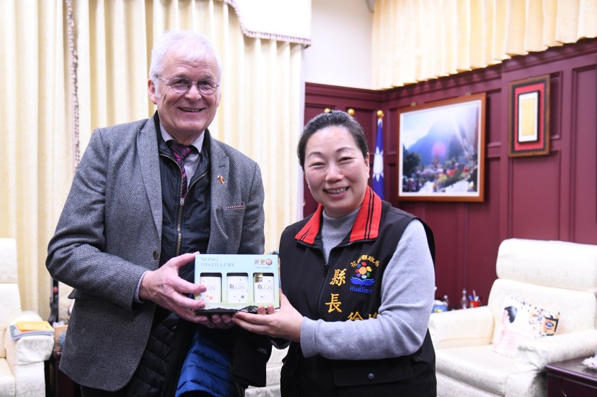 與會人員包括民政處長明良臻、行政暨研考處代理處長葉俊麟、花蓮縣政府秘書田俊雄、中德文化經濟協會榮譽理事長韓宜靜,現場徐縣長也致贈透光石畫燈、花蓮在地物產琴酒三部曲,期盼藉由此次會晤,共同推動更完善的國際交流計畫。
