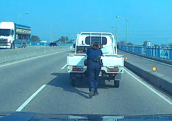 大平派出所所長孫得恩說明,李姓民眾駕駛自用小貨車不明原因拋錨於里港大橋上,嘗試數次仍無法正常發動。因里港大橋屬台三線,是連接里港與旗山美濃交通要道,大型車往來眾多車流量大,十分危險。警員潘彥辰為避免後方來車閃避不及追撞釀成事故,主動施以暖援,與李姓駕駛輪流推車近一公里下橋,警員鍾佩娟則駕駛巡邏車於後方警戒,適時鳴笛提醒後方來車,安全維護交通管制。潘、鍾二員迅速排除交通障礙,即時化解交通危機,民眾對員警的熱心協助深表感謝。