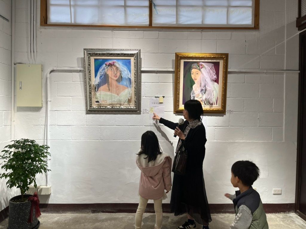 此次參展學員橫跨兒童與成人技巧班,創作媒材多元豐富,有油畫、壓克力、水彩、素描、粉彩、色鉛筆等,以不同風格詮釋「婚紗」意象,主題涵蓋懷舊典雅的經典風格,或是充滿夢幻色彩的現代創作,都體現對藝術的熱愛創意與巧思投入。其中,資深學員李美惠以35年前的婚紗照為靈感,將過往與現代當下交織,創作出帶有時光感的兩幅畫《對話.對畫》,巧妙運用複合式媒材來詮釋,讓觀者能夠透過畫作思考與對話、留言互動,更可掃描下方說明欄的QR code聆聽獨創音樂,極具寬廣巧思。旅美多年返台的學員董文菁表示,因曾觀賞陳老師第一次在吉安鄉好客藝術村舉辦的畫展後,深受感動而開始跟著陳老師學畫,在美國期間持續利用網路視訊上課,此次展出作品《海上新娘》象徵她對國際人生觀階段的擁抱,對藝術堅持與自我探索抱負。