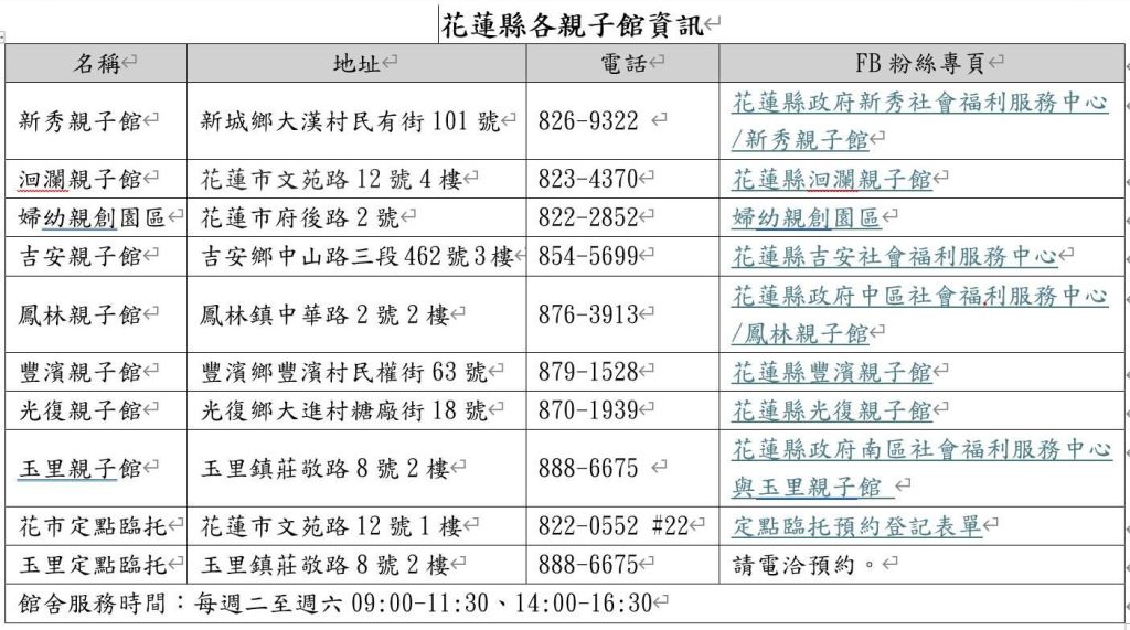 花蓮縣長徐榛蔚高度重視育兒支持政策,考量全縣幼兒家庭的實際需求,責成社會處積極布建親子館及親子據點,以減輕家長的育兒負擔,並提供更完善的托育資源。目前,縣內已設置7處親子館(洄瀾、新秀、吉安、鳳林、光復、玉里、豐濱),館內均聘用專業人員,規劃符合幼兒發展的遊戲,安全舒適的親子共玩空間,提供育兒照顧及親職講座課程、親子活動、幼兒照顧諮詢及社區宣導服務等。其中北區(花蓮市)及南區(玉里鎮)提供定點臨時托育服務,滿足育兒家長臨時性的照顧資源補給,讓幼兒擁有專業安全的照顧服務。