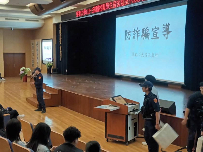 為提升大學生對交通安全與詐騙防制的認識,花蓮縣警察局吉安分局太昌派出所於昨(11)日晚間7時許,在慈濟大學禮堂舉辦交通安全及識詐宣導活動。活動由太昌派出所所長孫豈親自講解,向現場約300名學生宣導交通法規、路權觀念,並介紹最新詐騙手法及防範對策,期望透過案例分享與互動,加深學生對交通安全及識詐觀念,避免成為詐騙或交通事故的受害者。