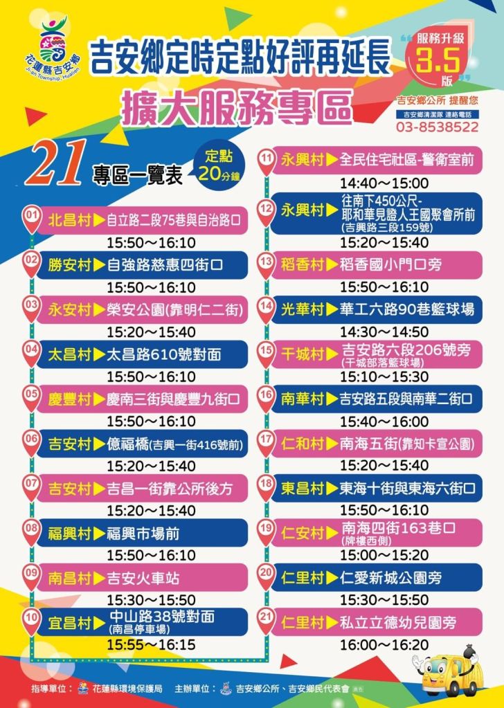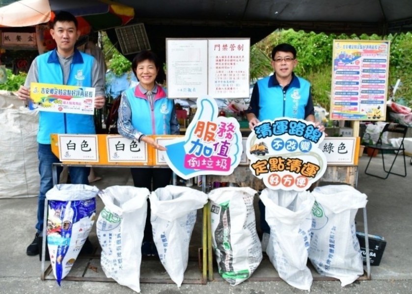 花蓮縣吉安鄉是全縣十三鄉鎮市,第一個執行垃圾定時定點示範的鄉鎮,過去獲得鄉親非常多的好評和認同,鐵人鄉長游淑貞也將民意化為行動力,年年依各村需求增加定時定點站,今年再度擴大升級至21個垃圾清運點,在村鄰街巷中提供更完善的垃圾去化清運選擇。垃圾車會在指定時間內於各定點停留20分鐘,方便民眾利用,並以此降低鄉親追逐垃圾車的困擾,且有效提升資源回收分類效益;且不影響夜間清運時間配套,提供倒垃圾多元選擇,讓吉安鄉垃圾清運效率再升級。