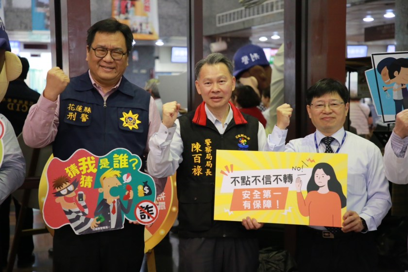 花蓮縣警察局局長陳百祿呼籲,打擊詐欺需要聯合全民共同宣導詐騙手法,花蓮縣警察局仍持續利用各種場合及多媒體平台進行反詐騙,以提升民眾「識詐、堵詐、阻詐、懲詐」意識,保障民眾的財產安全。