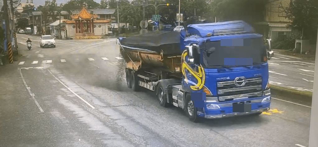 經警方調閱監視器,發現一部曳引車於事故前行經此處車斗有明顯土石掉落路面,警方將通知此車駕駛釐清案情。