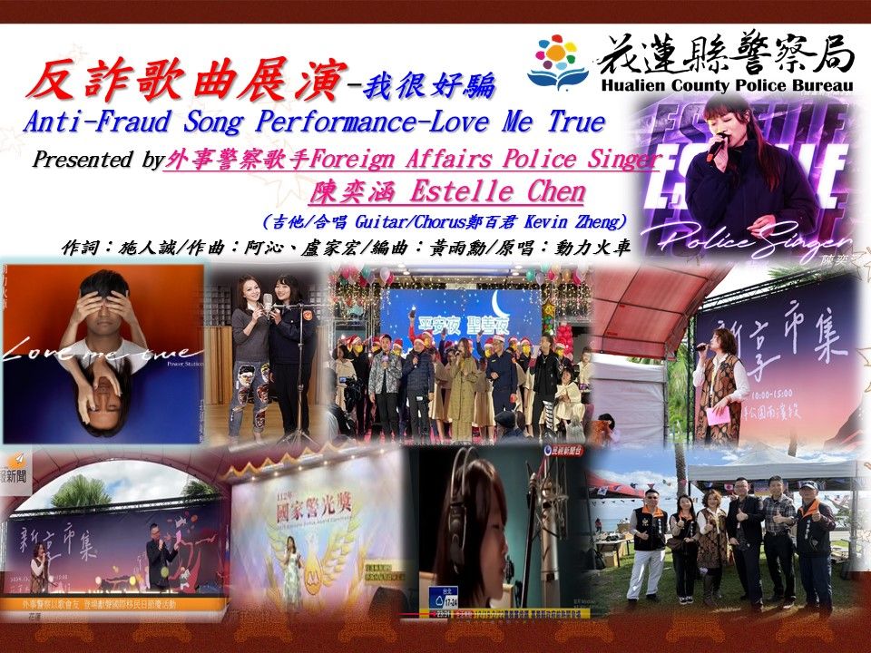 「外事警察歌手」Estelle陳奕涵,臺灣警察專科學校三十二期畢業,現於花蓮縣警察局外事科服務,涉外治安事件處理經驗豐富,公餘之際積極參與演藝及歌唱活動,曾擔任花蓮縣「國際移民日」慶典活動表演歌手、國家警光獎「警察故事百年傳承」開場表演歌手、新北耶誕城「新北心警」超偶表演歌手,另亦曾於「張韶涵全民翻唱大賽歌唱選秀比賽」脫穎而出獲得冠軍,而與藝人張韶涵合作錄製專輯MV,現持續以歌唱才藝融入各類警政宣導活動展現獨特亮點。