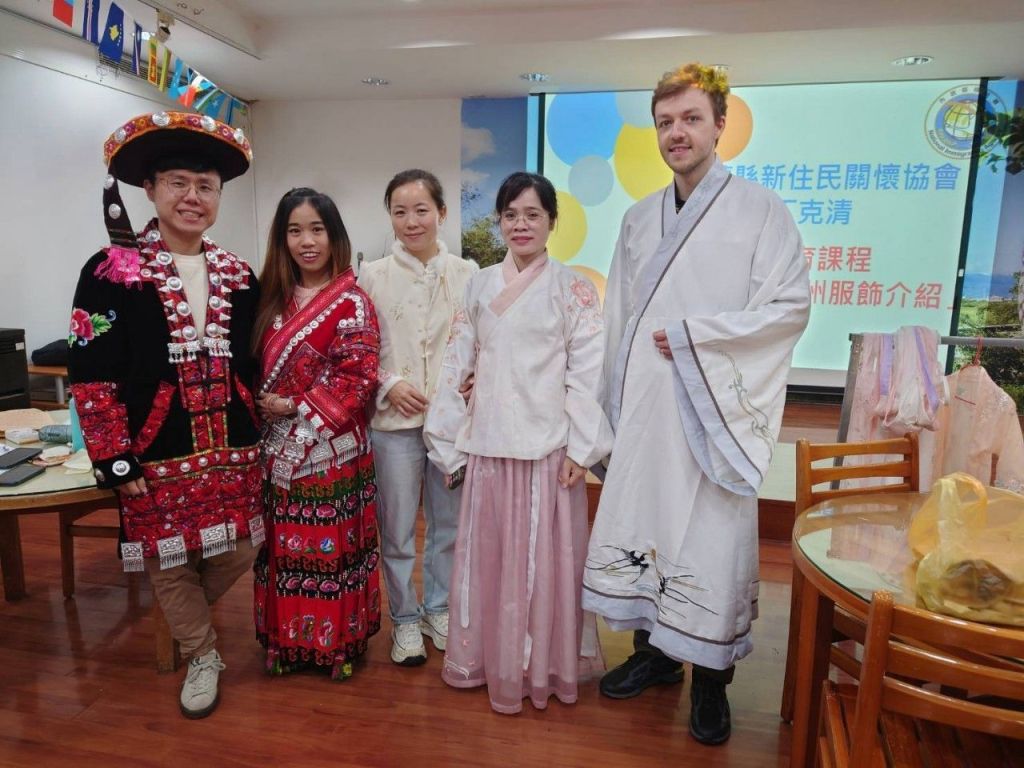 丁克清另向學員們解說其家鄉—貴州當地苗族的傳統服飾,苗服主要用於接待貴賓、主持婚嫁等隆重場合,由棉、麻等材質的手工布編織而成,再以許多五彩繽紛的苗繡圖案點綴。此次介紹的苗服主要以紅色為主軸,搭配許多華麗的銀飾配件,看起來格外賢淑端莊,現在苗服在當地仍非常受到居民的喜愛,特別被廣泛使用於婚嫁儀式。除介紹傳統苗服外,丁克清也帶來由大陸朋友設計、製作的漢族服飾,由淺藍色及紅色布料搭配組成,該撞色的設計,呈現出與苗服不同的美感。課程活動現場邀請新住民家庭成員一起試穿兩種不同的傳統服飾,體驗道地貴州生活,促進文化交流,展現我國新住民的文化多樣性。