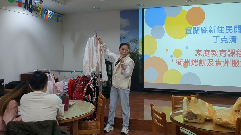 移民署宜蘭縣服務站於114年3月19日舉辦家庭教育課程,邀請來自貴州黔東南苗族侗族自治州的丁克清擔任多元文化講師,除了向來自各國的新住民學員們介紹貴州當地苗族的傳統服飾,並分享自己手工製作的大陸浙江著名小吃—衢州烤餅,讓學員充分感受體驗多元文化。