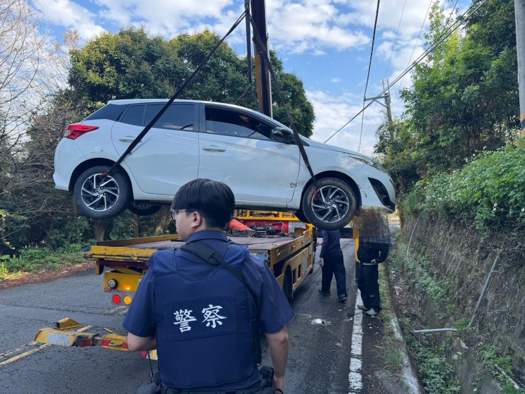 雲林縣警察局斗南分局東和派出所員警接獲報案人表示開車行經山區時,不慎將車輛駛入路旁水溝,造成半輛車懸空、動彈不得。