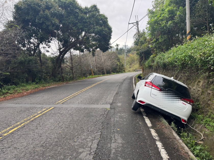 雲林縣警察局斗南分局東和派出所員警接獲報案人表示開車行經山區時,不慎將車輛駛入路旁水溝,造成半輛車懸空、動彈不得。