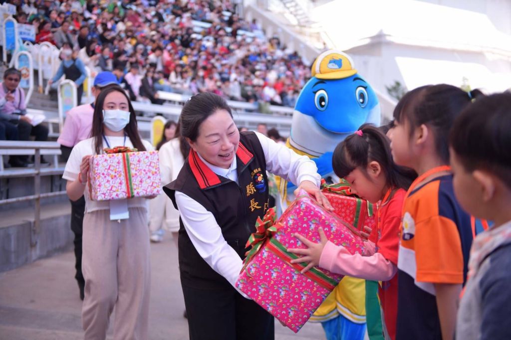 一進到海洋公園,迎賓的吉祥物們馬上吸引小朋友的目光,吉祥物除了跟小朋友揮手道早外,也與小朋友們親切熱情地合照,更配合來個愛的抱抱,逗趣幽默的表演為現場添增不少歡樂的氣氛。為了讓此次參加活動的孩子有個難忘之旅,開幕的第一個活動為縣長頒發兒童節禮品「拼圖積木玩具」,代表53所幼兒園的幼生皆露出燦爛的笑容和縣長合照。現場還有充滿健康與活力的親師生唱唱跳跳健康操、魔術表演、變臉表演、親子遊樂區、主題造景及打卡區,希望藉此活動親子同樂,共度難忘的周末。