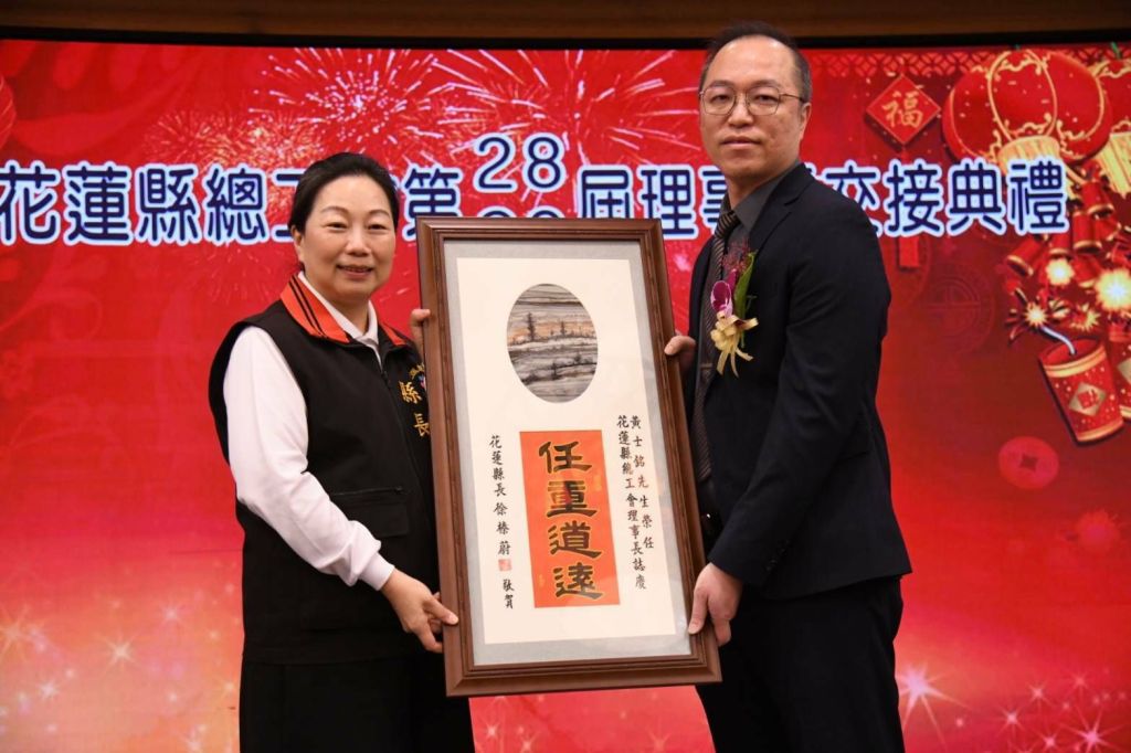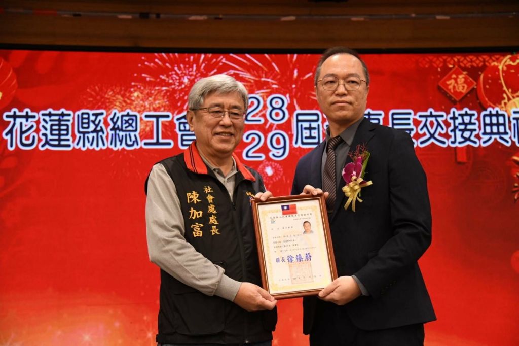 花蓮縣總工會今(22)日在福容飯店舉行「第28/29屆理事長交接典禮」,縣長徐榛蔚出席見證第28屆理事長陳光火將重任交接給第29屆新任黃士銘理事長。徐縣長期勉新任團隊持續攜手花蓮縣政府,為縣內勞工朋友的福利、工作環境、職業安全等,一起打拼努力。
