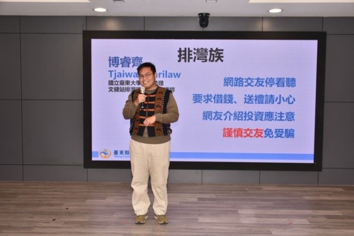 王副縣長首先感謝受邀的原住民來賓協助縣府在防詐騙宣導,並提到臺東縣有1/3人口為原住民,且縣內有7個原住民族族群,包含阿美族、卑南族、布農族、雅美族、排灣族、魯凱族及噶瑪蘭族,是臺灣各族群匯萃的熔爐,使得今日的臺東呈現出豐富、多元的樣貌。這次特別邀請4位原住民族人以族語來宣導高發詐欺手法,希望能有效將識詐宣導深入部落。