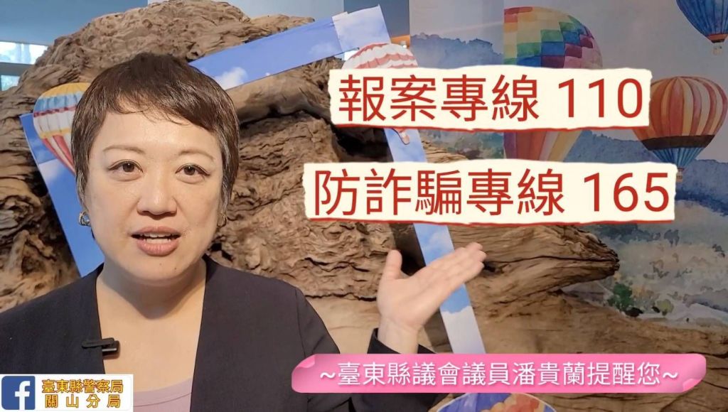 臺東縣警察局關山分局為擴大反詐騙宣導成效,特別邀請臺東縣議會議員潘貴蘭參與反詐騙創意宣導短片拍攝,並由偵查隊隊長鄭志舷擔綱演出「警察叔叔」,以淺顯易懂的方式錄製三段防詐短片,內容涵蓋「詐騙假簡訊」、「假銀行凍結帳戶」及「假親友詐騙」等常見詐騙手法。議員潘貴蘭更在短片最後親自「發聲」呼籲民眾提高警覺,守住自身財產安全。