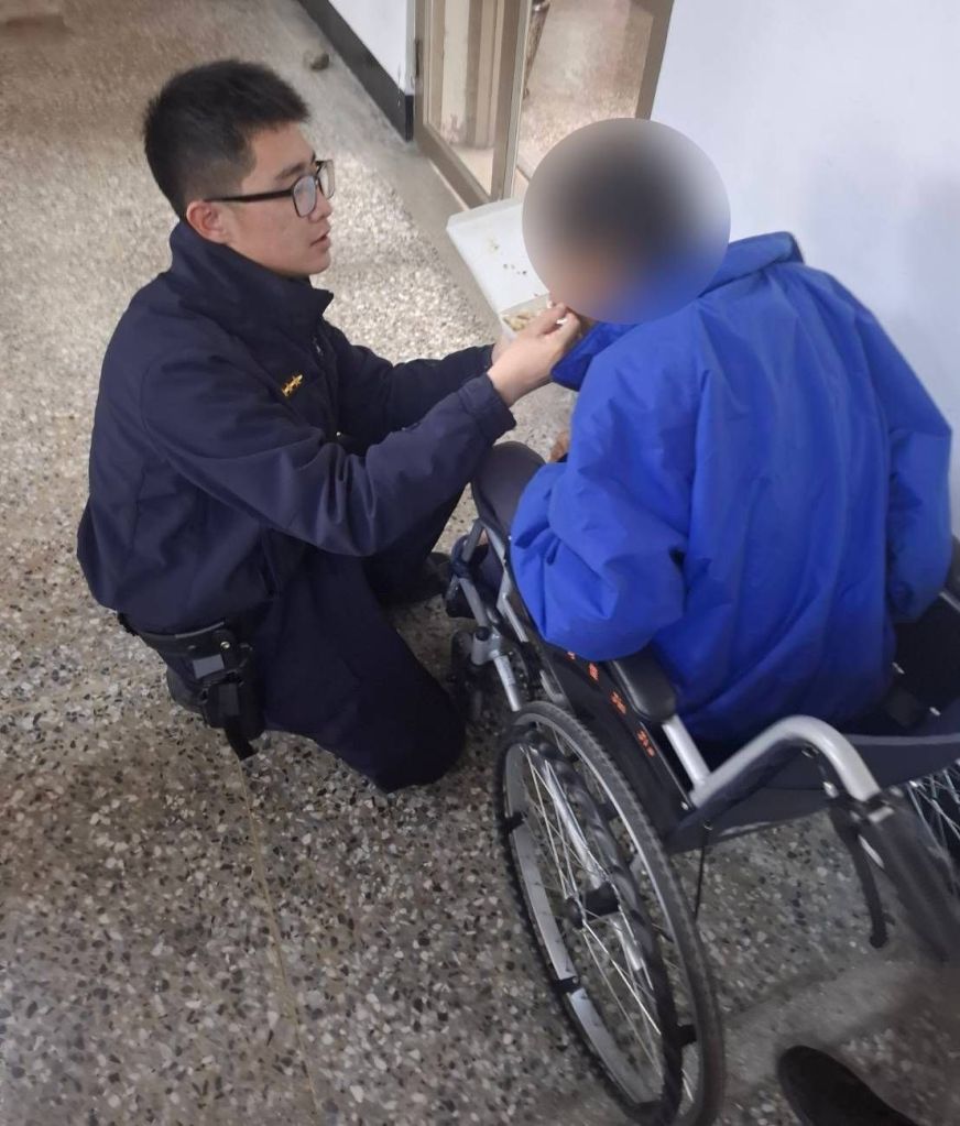 臺東縣警察局關山分局關山聯合所警員李東錦與黃彥儒於今(25)日11時30分許,執行家戶訪查勤務巡經鎮內民族路段時,發現一名坐著輪椅、手部包紮繃帶的長者,獨自停留在馬路中央,神情茫然,疑似迷失方向。兩名員警考量其安全,立即上前關懷詢問,惟長者語言表達困難,無法清楚說明自身狀況,遂主動協助將其推返所內查詢身份。