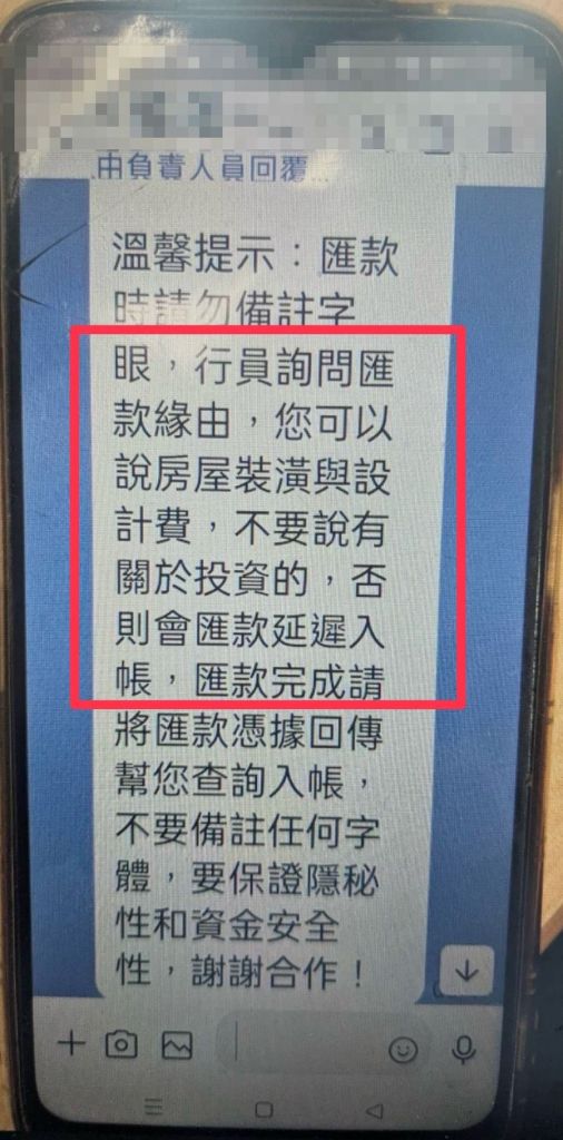 然而,曹男起初仍深信詐騙集團之話術,堅持表示這筆款項是「裝潢費用」,並未察覺異常。警方見狀,進一步請曹男回顧與對方的對話內容,並強調詐騙集團會教導被害人,如有行員或警方問起匯款目的時,要堅稱該筆匯款是「裝潢費用」,不能提及投資,否則匯款會被延遲入帳。經過警方耐心勸說,曹男才願意相信自己險些受騙,並當場取消匯款交易,成功保住新台幣6萬元。