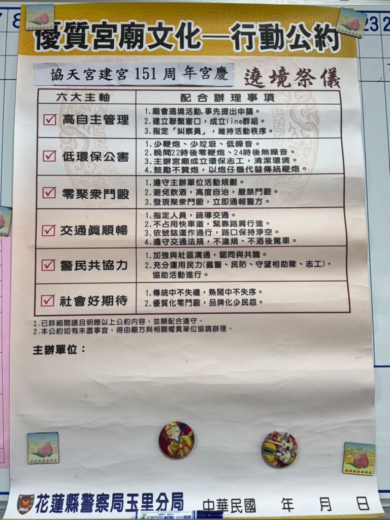 活動期間,希望民眾以「熱情」代替「激情」,莫讓傳統民俗文化變質;活動由協天宮主辦規劃,為避免遶境陣頭鬥毆及青少年聚眾滋事,玉里警分局在今(26)日由分局長黃清暉親率副分局長、各組、隊長及玉里所長前往協天宮召開「優質宮廟文化-行動公約」遶境協調會,並強調如有暴力滋事情形發生,警方「絕不寬貸、強力執法」來制止。另外,也特別提醒交通方面相關規定,信眾駕駛交通工具嚴禁「未配戴安全帽、酒後駕車」等違規行為,違者將依法加強取締及告發。會議的最後由分局長黃清暉與總幹事吳俞螢共同簽署「優質宮廟文化-行動公約」,防止有心人士於接轎時滋事,進而衍生打架鬥毆情事發生。