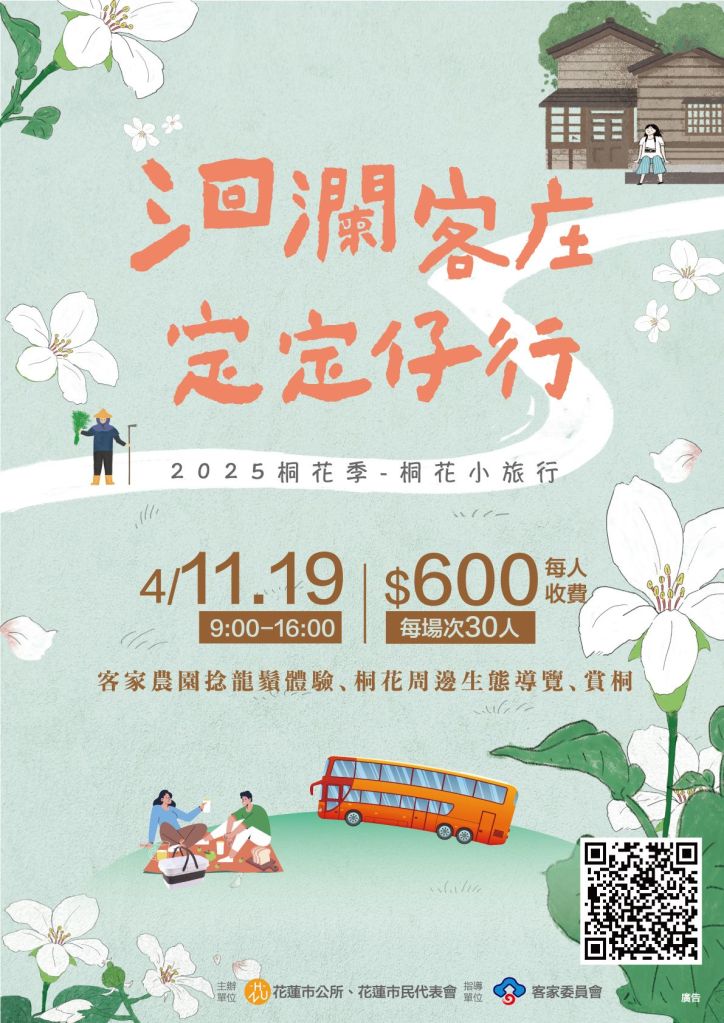 「定定仔行-來尞桐花」小旅行,共分為4月11日、19日二梯次,每梯次報名人數限額30人,報名費用每人次600元(含午餐、手作、交通、保險),完成報名再送限量野餐籃及環保瓶。報名請上表單 https://forms.gle/cSeS2HKpxfpWQwZP9 ,或洽客行所專線03-8350315及花蓮市好客文化會館臉書粉絲專頁。