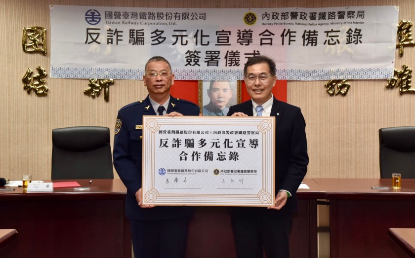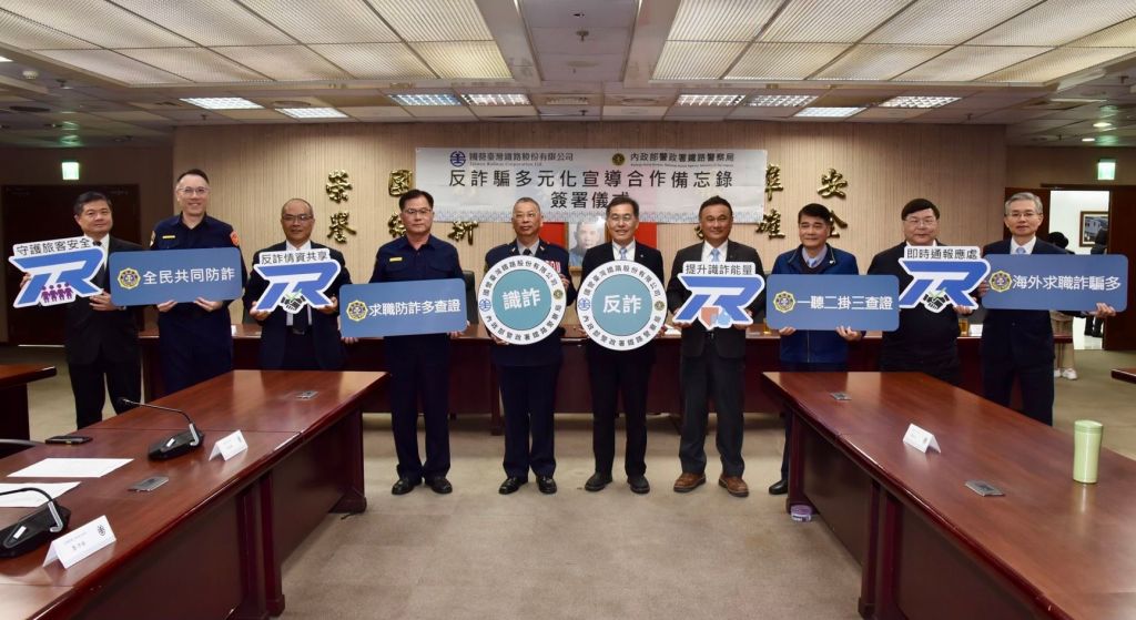 為加強鐵路運輸環境的反詐騙防護力,內政部警政署鐵路警察局(鐵警局)與國營臺灣鐵路股份有限公司(臺鐵公司)今(26)日正式簽署「反詐騙多元化宣導合作備忘錄」,共同推動反詐騙宣導,透過多方合作,提升旅客與鐵路從業人員的防詐意識,攜手打造更安全的旅運環境,此次合作亦特別針對海外求職詐騙加強宣導,以防範更多民眾受害。