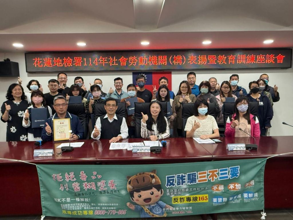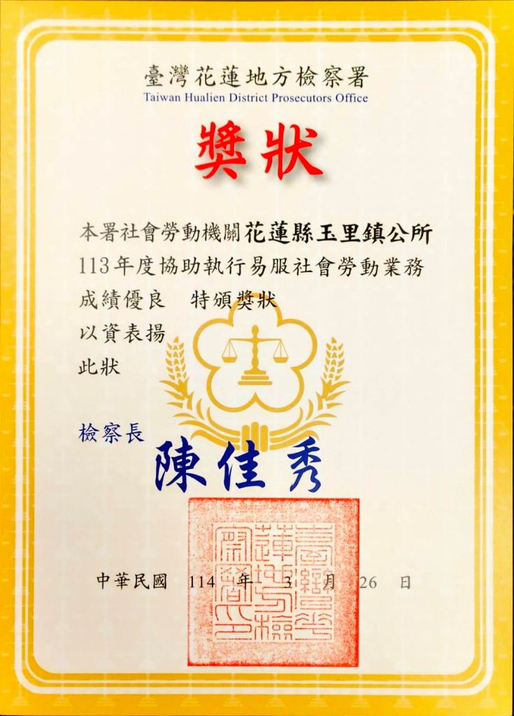 花蓮地檢署於昨(26)日上午9時假3樓會議室召開「114年度社會勞動執行機關表揚暨教育訓練座談會」,邀集轄區內24個執行機關承辦人員參加,檢察長陳佳秀親自到場致詞、頒發執行機關聘書,玉里鎮公所並獲頒113年度績優執行機構。