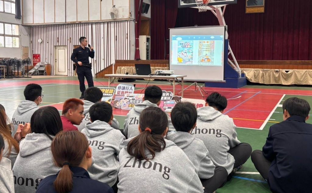 除了網路安全議題,警員們也特別強調「交通安全」的重要性。黃彥儒指出,青少年正值叛逆期,容易因追求刺激或同儕影響而忽略交通規則,例如無照駕駛、超速、未戴安全帽等行為,不僅違法,更可能造成嚴重後果。他透過實際案例分享,讓學生了解交通違規可能導致的事故傷害,甚至危及生命,呼籲學生應遵守交通規則,保護自身與他人的安全。警員陳奕樺表示,青少年時期是人格發展的關鍵階段,容易受到外界影響而產生偏差行為。他呼籲家長與學校應多關注青少年的日常生活與心理狀態,若發現異常行為,應及時溝通與引導,必要時可尋求警察協助,及早發現問題並加以糾正,避免青少年誤入歧途。