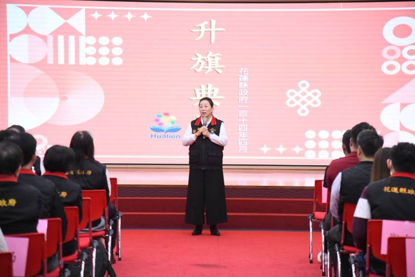 花蓮縣政府今(1)日上午舉行四月份升旗典禮,由縣長徐榛蔚主持,徐縣長期許同仁們恪盡職守,發揮公務最大效率及效能,同心同德持續為縣爭光,提升花蓮鄉親福祉及權益,攜手同心將花蓮打造為幸福城市。