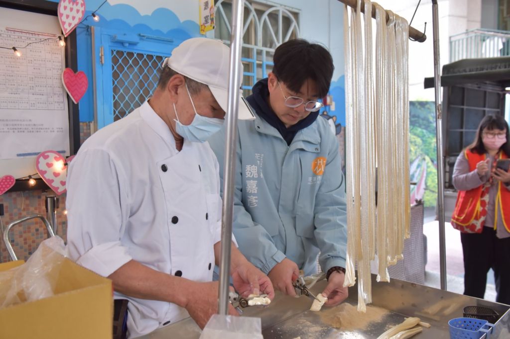 而大班的哥哥姐姐則是在校園內跟何師傅一起學習棉花糖、麥芽糖餅跟白糖蔥的製作,來自台中的何師傅固定會在光復糖廠表演這些傳統民俗技藝,這次特別受市幼之邀來到學校,教導孩子們簡單的麥芽糖餅製作方法,魏嘉彥市長也在師傅的指導下,親自體驗一把棉花糖的製作,大家吃的甜滋滋也玩的不亦樂乎。