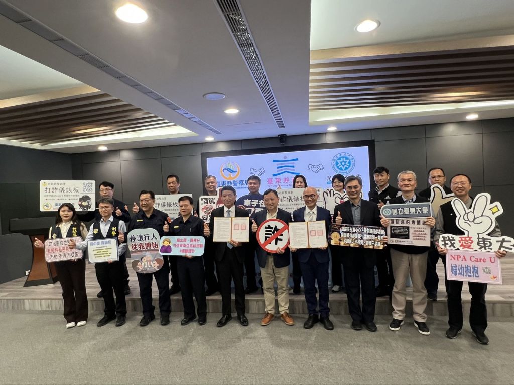 為打造師生安全環境,臺東縣警察局與臺東大學今(7)日10時共同召開「警教齊心、跨界合作」合作備忘錄簽署儀式暨防詐記者會,由副縣長王志輝主持、見證,2位副局長、刑事警察大隊長、交通隊長、婦幼隊長、4位警分局長及公關科長等與會,同時向民眾報告3月份及2月份詐欺數據比較。由於民眾常誤入詐騙手法陷阱,造成財產損失,東縣警局呼籲全民關注詐騙議題,守護打拚的辛苦錢。
