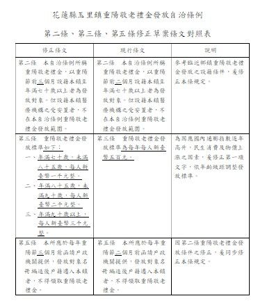 2、年滿八十五歲,未滿九十歲,每人新臺幣二千元整。3、年滿九十歲以上,每人新臺幣三千元整。三是修正戶政機關提供日期:原條例第五條公所應於每年重陽節二個月前函請戶政機關提供,發放對象名冊編造後戶籍遷入玉里鎮者,不得領取重陽敬老禮金。修正為公所應於每年重陽節三個月前函請戶政機關提供,發放對象名冊編造後戶籍遷入玉里鎮者,不得領取重陽敬老禮金。