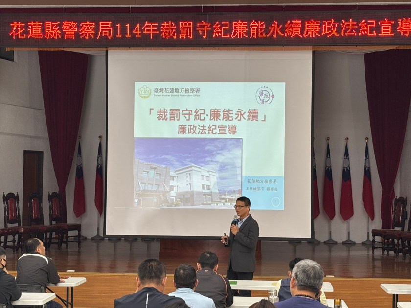 花蓮縣警察局為建立警察同仁廉潔素養與正確法紀觀念,於15日在警察局親民堂舉辦114年廉政法紀教育訓練,邀請臺灣花蓮地方檢察署主任檢察官蔡勝浩擔任講座,針對公務執行中應具備的法律觀念進行深入剖析,現場參與人數近百人。